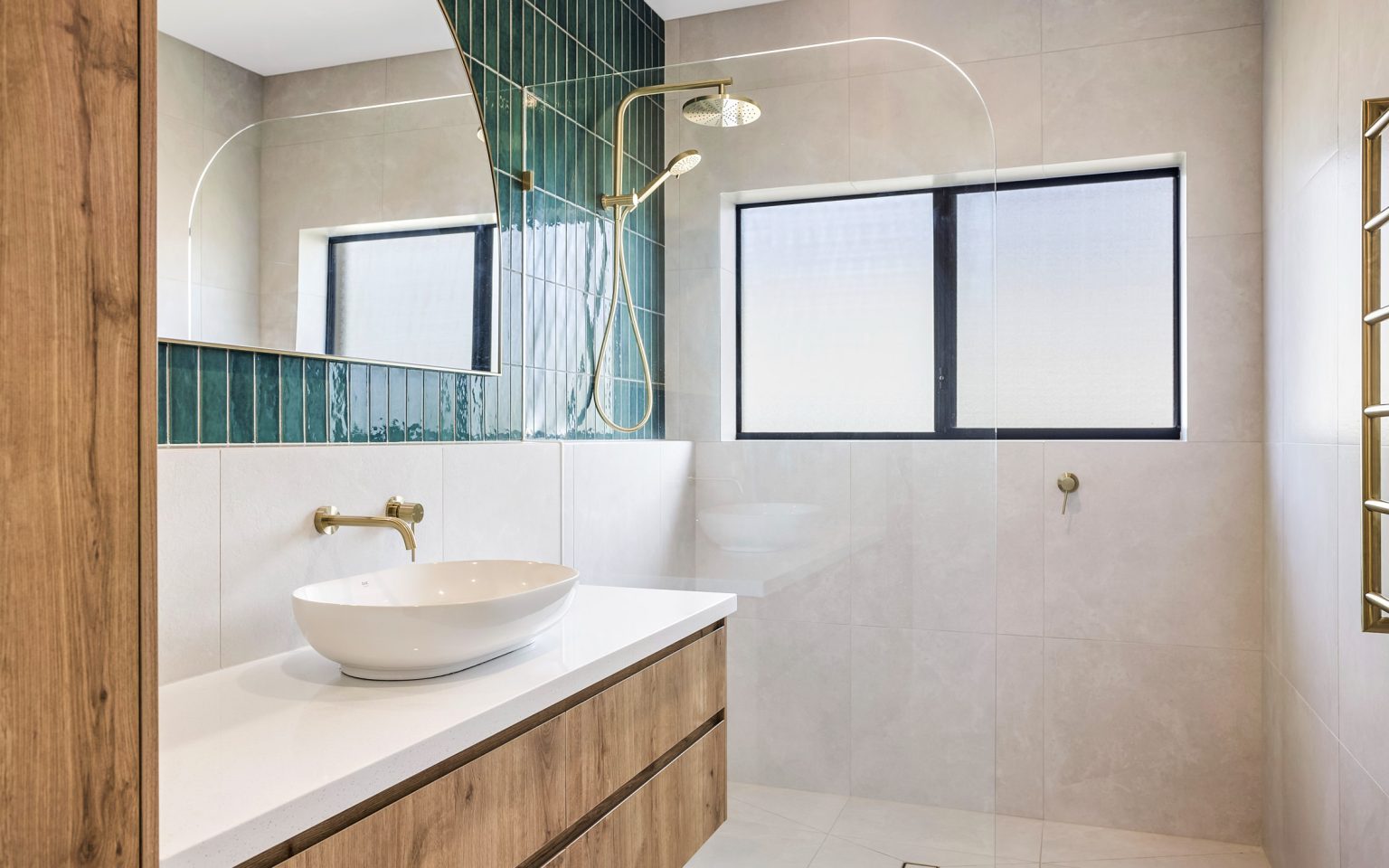One of our main tasks was to assist in selecting all of the necessary materials, including fixtures and fittings, for the renovation. Our clients wanted their coastal family holiday home to feel fresh, light and just like a home away from home. To achieve this, we suggested adding a deep green feature tile to all of the wet areas. This added warmth, depth, and style to the space. We also incorporated timber veneers in the bathrooms, power room, and laundry, which added a touch of natural beauty to the space.